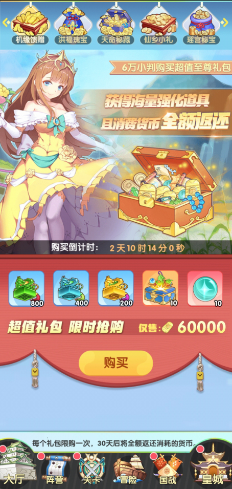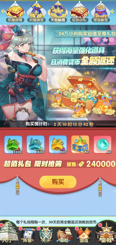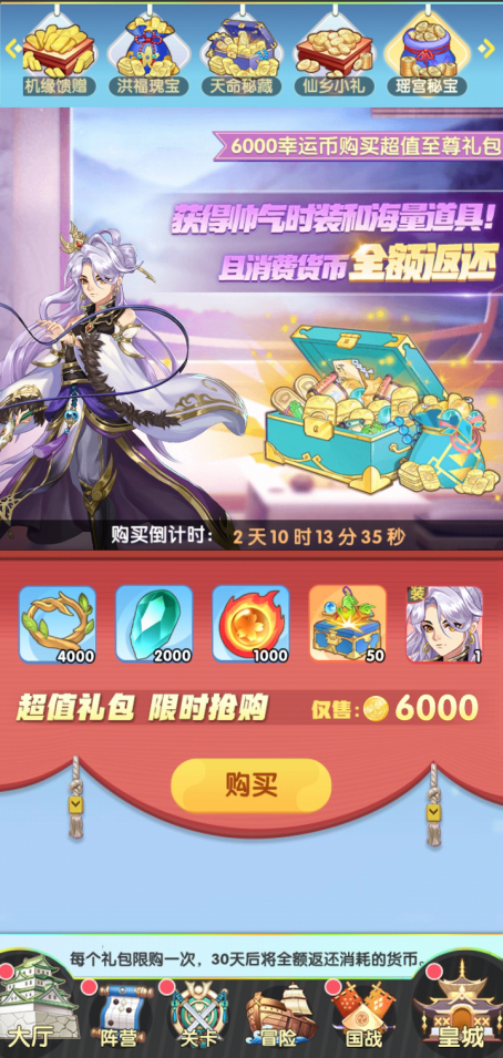 5.【天降豪礼 消费返还】福利银行相信各位少主都不陌生,此次豪礼馈赠可媲美福利银行,消耗幸运币和小判,可获取相应妃子、时装和强力道具,且消耗的货币(小判、幸运币)在30天后将全额返还,免费纯享!此次档位较多,有1200/6000/12000幸运币档位和6W/12W/24W小判档位,福利满满,冲鸭!(创角60天后开启)
