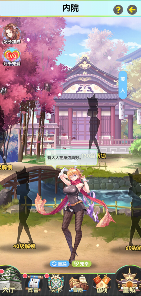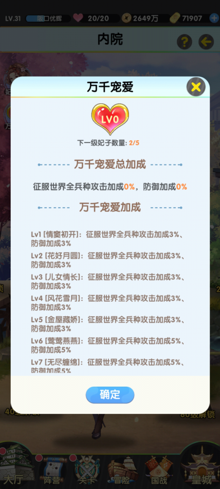 皇城内增加后宫庭院啦!根据少主们自身的等级,庭院最高可同时展示8位妃子!如何抉择呢?不用纠结,上阵妃位最高的妃子,来获取最高收益的兵府司加成,当然,有钟爱的,可以由着自己性子专宠上位(^U^)!除此之外,妃子数量将提供征服世界兵种加成,古德古德,妃子们也将为各位少主的事业贡献一份力啦!